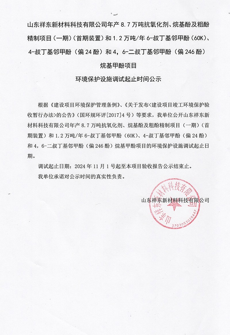 烷基甲酚項(xiàng)目環(huán)境保護(hù)設(shè)施調(diào)試起止時間公示