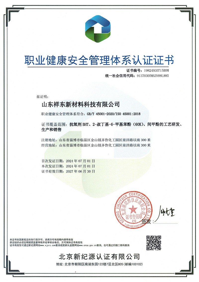 山東祥東新材料科技有限公司1.2萬(wàn)噸/年6-叔丁基鄰甲(60K)、4-叔丁基鄰甲酚(偏 24 酚)和 4,6-二叔丁基鄰甲酚(偏 246 酚)烷基甲酚項(xiàng)目竣工環(huán)境保護(hù)驗(yàn)收監(jiān)測(cè)報(bào)告